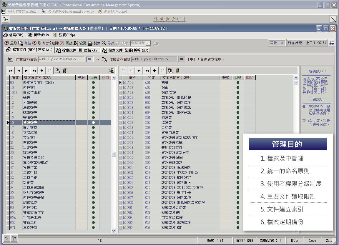 電子文件檔案管理是大部份公司最難以管理之課題,而檔案的管理,卻又深遠影響公司競爭優勢的首要條件,透過唯一的入口管理,讓同仁的工作檔案得以集中管理,依系統之規劃及統一的命名原則來新增檔案,並藉以檔案目錄的索引,得以快速找到檔案,建立標準的參考檔(模擬檔),縮減同仁重新建立檔案的時間,提升工作效率,即使因時代管理的背景不同,管理變動的調整,仍能將公司經營歷程的心血完整保留,是檔案管理的宗旨。